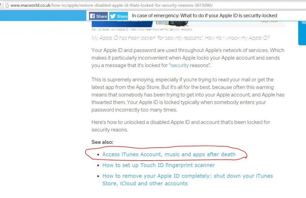 Прошу прощения за очередную порцию черного юмора, но ситуация буквально пятиминутной давности. У коллеги залочился Apple-ID на ЙаПапке, пока он ковырял настройки, я полез на саппорт коммьюнити смотреть.. Не знаю откуда, но походу Apple что-то знает о потустороннем мире и жизни после смерти: кто не понимает по иханному, то после "Смотри также", фраза в кружочке переводится как: "Доступ к аккаунту iTunes, музыке и приложениям после смерти"